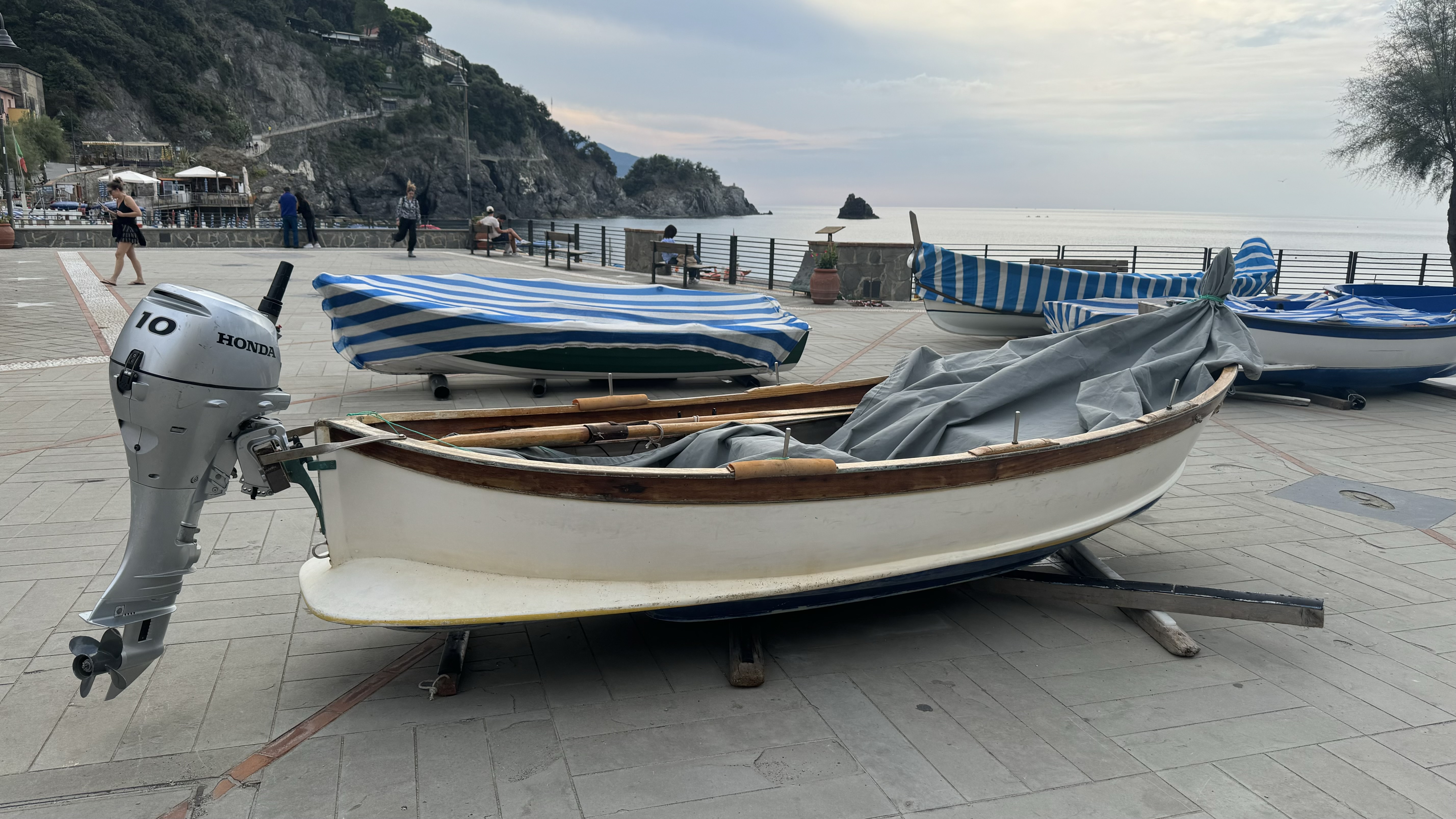 The train ride back to town was standing room only. The next morning we got up early and decided we liked Monterosso so much we would find breakfast there, in the same spot as yesterday’s coffee. We had the place to ourselves. After our yogurt, muesli, croissant and coffee we explored more of the village before we boarded the train for our final of the five villages, Manarola. By mid morning it was already getting crowded. After a little exploring we topped off our water bottles and found the trail to Riomaggiore. The map said it was less than a mile away, with only 700’ of climbing. This trail was the hardest. I think it required more energy climbing out of Manarola than it did climbing the “cleaver” towards the summit of Rainier. In less than a 1/4 mile we gained those 700’. The path is narrow and interesting when meeting folks coming down. The view at top was literally breathtaking. We could look straight down and see the flat “trail of love” and decided there is more love in climbing a hard path together than paying for the easy way. The path down seemed to go by fast and soon we were back in Riomaggiore and another Bierra Moretti. One last train ride and we are in La Spezia by early afternoon. Another nap and another shower and we found a restaurant that was actually open by 5pm for some pasta. The streets were quiet as we strolled towards the marina. There was some sort of carnival going on and we wondered what we got ourselves into. As it approached evening the streets filled up. We ended our time in La Spezia by finding a gelato stand and sat by a fountain enjoying our ice cream.